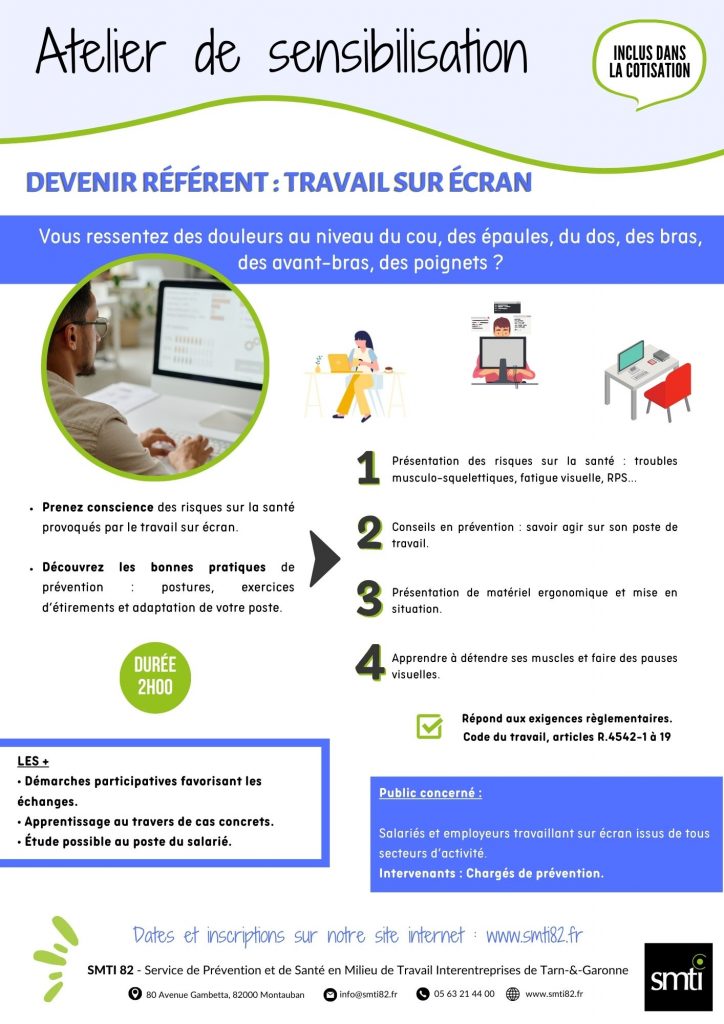 Vous ressentez des douleurs au niveau du cou, des épaules, du dos, des bras, des avant-bras, des poignets ? Nous vous proposons un atelier de sensibilisation sur le travail sur écrans. Prenez conscience des risques sur la santé provoqués par le travail sur écran.