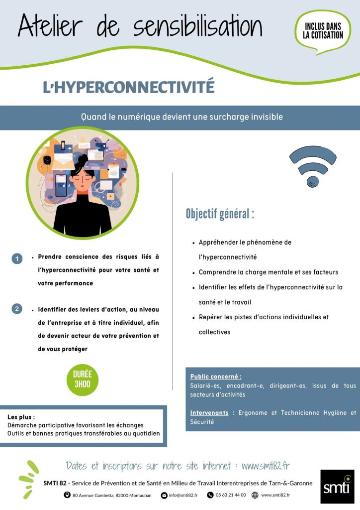 Cet atelier de sensibilisation a pour objectif d’aider les participants à mieux comprendre les enjeux de l’hyperconnectivité au travail, à en identifier les impacts sur la santé et à découvrir des bonnes pratiques pour un usage plus équilibré et protecteur du numérique.